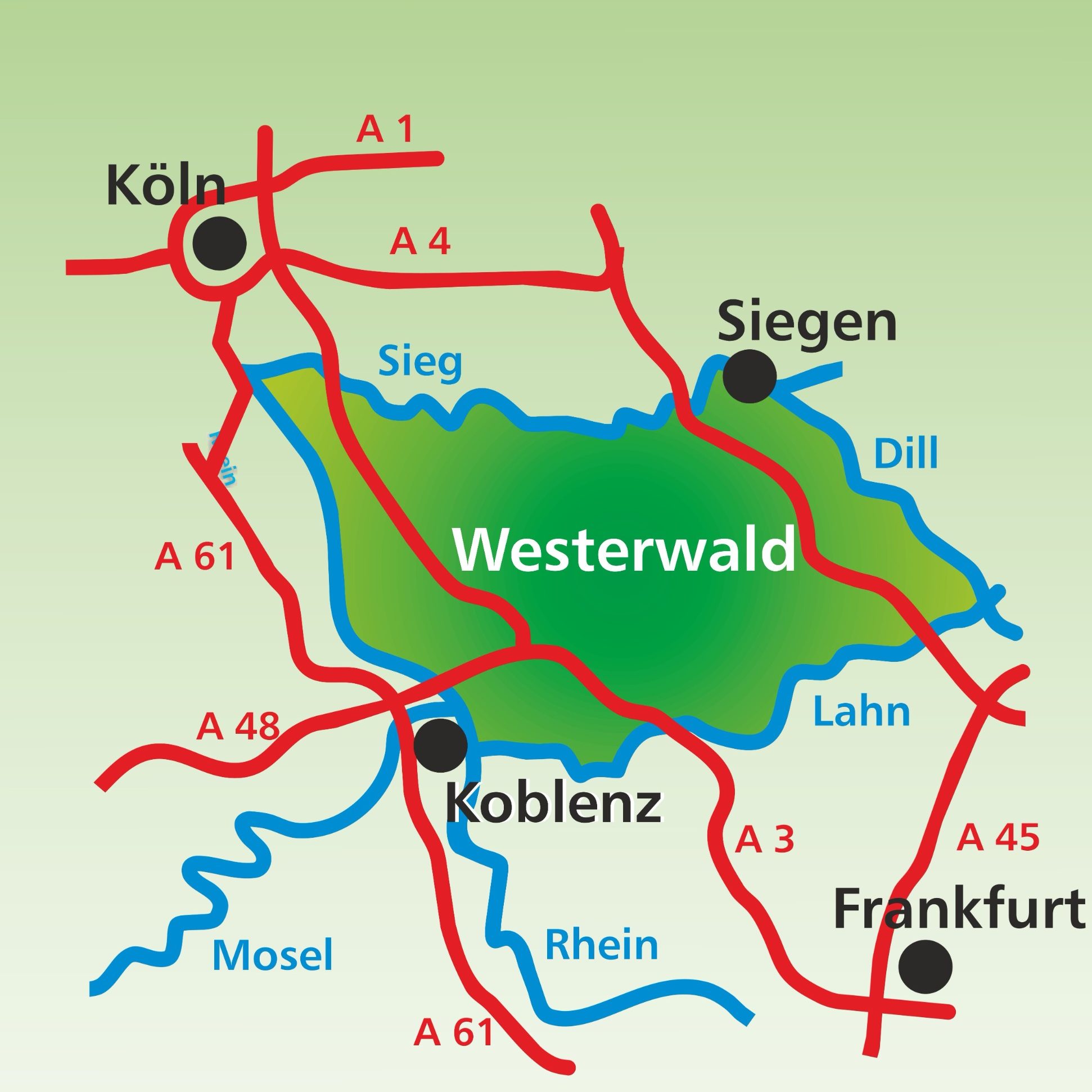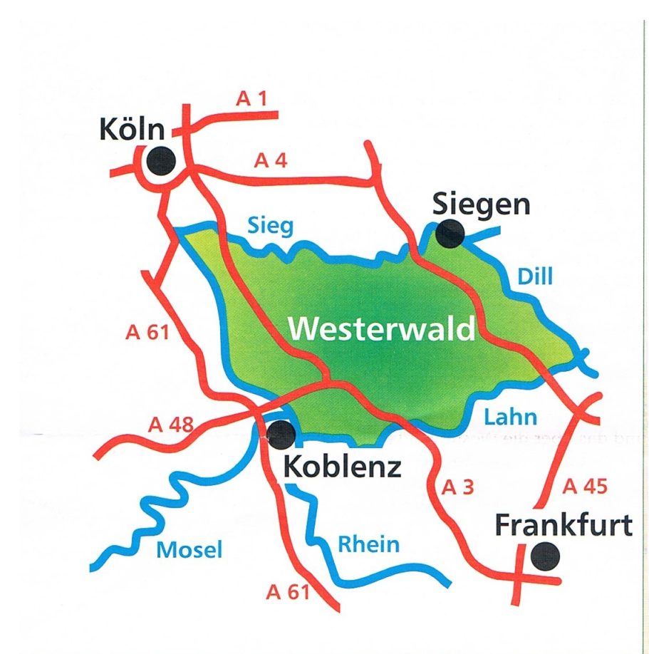 Der Westerwald wird landläufig definiert als jenes Land zwischen den Flüssen Dill im Osten, Lahn im Süden, Rhein im Westen, Sieg im Norden und Heller im Nordosten.
